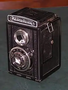 | Комсомолец 1946-1951 | ![]() | ГОМЗ | Среднеформатный двухобъективный зеркальный фотоаппарат, видоискатель зеркальный, только для визирования и кадрирования, фокусировка по шкале расстояний (шкальный фотоаппарат). Центральный затвор. Плёнка типа 120, размер кадра 6×6 см. Разработан на базе конструкции немецкого двухобъективного зеркального фотоаппарата 1930-х годов «Voigtländer Brilliant». |