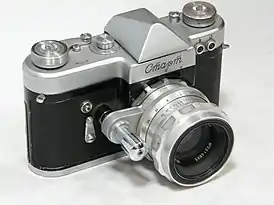| Старт 1958-1964 | ![]() | КМЗ | Малоформатный однообъективный зеркальный фотоаппарат высокого класса. Шторный затвор с увеличенным диапазоном выдержек. Съёмная пентапризма, зеркальный видоискатель с большим полем зрения. Объектив с «прыгающей» диафрагмой, крепление — байонет особой конструкции. Курковый взвод затвора и перемотки плёнки. |