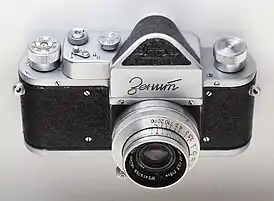 | Зенит-3 1960-1962 | КМЗ | Малоформатный однообъективный зеркальный фотоаппарат. Шторный затвор. Курковый взвод затвора и перемотки плёнки, нижняя зарядка плёнки. Крепление объективов — резьба M39×1/45,2. Модификация фотоаппарата «Зенит-С», унифицирован с дальномерным аппаратом «Зоркий-5». | |