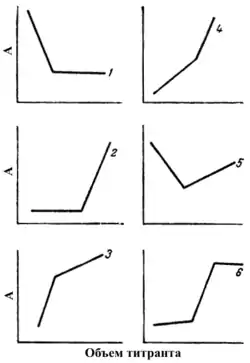 Кривые спектрофотометрического титрования могут быть различной формы, характер которых зависит от того, какие компоненты реакции поглощают при выбранной длине волны[7].