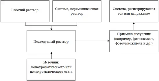Вообще, для титрования можно применять почти любой тип фотометра, заменяя обычные кюветы специальным сосудом для титрования. В современной химии, как правило, титрование проводят в кюветах в спектрофотометрах, снабженных специальными кюветными крышками с отверстиями для ввода кончика полумикробюретки и мешалки[2]. Роль параметрического стабилизатора источника излучения в видимой области выполняет лампа накаливания, в ультрафиолетовой области — водородная или дейтериевая лампа. Используются стандартные кюветы с толщиной поглощающего слоя от 2 до 5 см (в видимой области) и кварцевые или стеклянные кюветы (в УФ-области). Для дозирования рабочего раствора используют бюретки, в том числе и полуавтоматические[1].