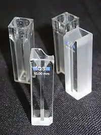 Если фотометрическое титрование проходит в области длин волн более 350 нм, то можно использовать обычные стаканы из пирексового стекла, однако важно, чтобы стакан был защищен от рассеянного света и был зафиксирован во время проведения всего метода, т.к. боковое освещение или поворот могут существенно изменить оптические характеристики анализируемого раствора. Если фотометрическое титрование проходит в области длин волн менее 350 нм, то необходимо применять кварцевые кюветы или кюветы из боросиликатного стекла. В этом случае титрант подается в кювету из полумикробюретки, кончик которой помещён в стакан вблизи поверхности анализируемого раствора. Перемешивание раствора может осуществляться током углекислого газа, азота, механической или магнитной мешалками[5].