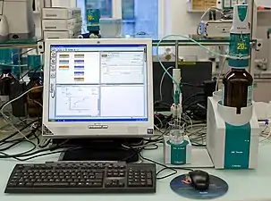 Существуют также и автоматические и полуавтоматические титраторы. В одних приборах может быть функция регистрации результатов анализа на самописце, в других в конечной точке титрования с помощью электрического устройства может автоматически закрываться кран бюретки. В современной аппаратуре предусмотрено компьютерное управление[4].