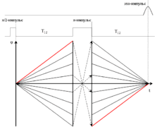 Под действием второго импульса допплеровские фазы осцилляторов изменяют знак, и расфазировка сменяется фазировкой (π-импульс). Когда все осцилляторы оказываются вновь полностью сфазированными, формируется эхо-импульс когерентного излучения.