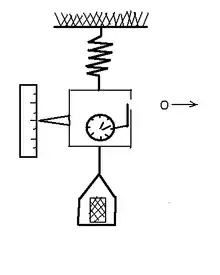 Предположим, что фотонный ящик для взвешивания подвешен на пружине, к нему прикреплена стрелка, а снизу к ящику прикреплена подставка с гирями для точной установки стрелки к нулю измерительной шкалы в процессе взвешивания (см. рис). Для взвешивания фотонного ящика необходимо установить стрелку весов, прикрепленную к ящику, в нулевое положение шкалы с некоторой наперед заданной точностью . Но, согласно соотношению неопределенностей, при этом возникает неопределенность импульса ящика ( - постоянная Планка):