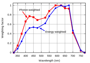 Как уже упоминалось выше, значение ФАР не учитывает разницу между разными длинами волн в диапазоне 400—700 нм. Кроме того, используется приближение, что волны за пределами этого диапазона имеют нулевую фотосинтетическую активность. Если известен точный спектр излучения, то фотосинтетический фотонный поток в мкмоль/с можно модифицировать, используя весовые коэффициенты для каждой длины волны. Этот параметр, представляет собой ФАР, взвешенную в соответствии с эффективностью фотосинтеза по каждой длине волны. Он носит название «усваиваемый растением поток фотонов» англ. yield photon flux (YPF)[1]. Красная кривая на графике показывает, что фотоны с длиной волны около 610 нм (оранжево-красный) обладают максимальной фотосинтетической активностью в расчёте на один фотон, поскольку коротковолновые фотоны несут больше энергии на один фотон. А вот максимум фотосинтеза в расчёте на одну единицу энергии находится при большей длине волны, около 650 нм (тёмно-красный).