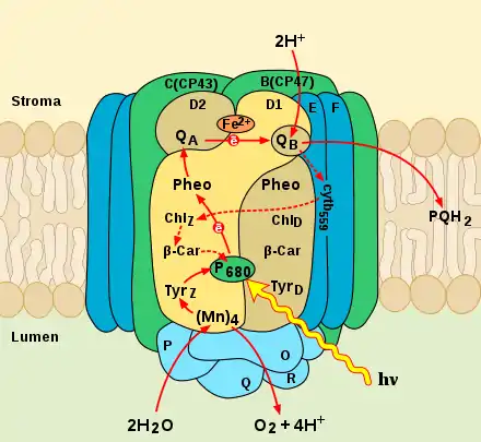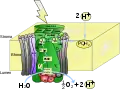 Главное отличие фотосистемы II от фотосистемы I — это наличие большого обращённого в люмен домена, который состоит из марганцевого кластера и окружающих его защитных белков. Именно здесь происходит процесс фотохимического окисления воды, сопровождаемый выделением кислорода и протонов[4].