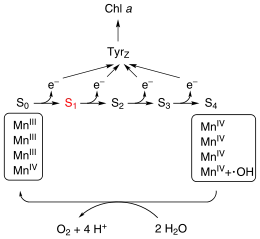 Состояние системы окисления воды меняется в зависимости от уровня окисленности атомов марганца в кластере. Представления о существовании отдельных функционально различимых состояний (S-состояний) водоокисляющей системы возникло на основе работ П. Жолио и сотр. (1969)[23]. Они показали, что при облучении адаптированных к темноте хлоропластов кратковременными вспышками света, выделение кислорода происходит колебательно, с максимумом на третью вспышку и периодом, соответствующим четырём вспышкам[24]. Опираясь на результаты этих экспериментов, Бессель Кок и сотр.[25] предложили модель S-цикла, согласно которой система окисления воды может находиться в различных состояниях, обозначаемых S0, S1, S2, S3 и S4. Переход из одного состояния в другое совершается в результате действия вспышки света и удаления электрона из системы. Выделение молекулярного кислорода из двух молекул воды происходит лишь при переходе из состояния S3 в S4, причём состояние S4 нестабильно и сразу же переходит в S0. Согласно современным представлениям, в ходе S-цикла изменяется валентность атомов Mn. В результате изменения окислительно-восстановительных свойств кластера достигается высокий потенциал (потенциал максимально окисленного кластера около +0,9 В), что делает возможным окисление воды. Этот процесс сопровождается выделением четырёх протонов в люмен, но оно не синхронизировано с выделением кислорода[12].