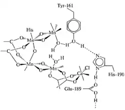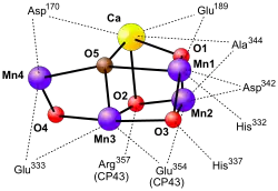 Марганцевый кластер состоит из четырёх атомов марганца в степени окисления от +3 до +5, пяти связывающих их атомов кислорода и одного атома кальция. Точная структура марганцевого кластера до сих пор остаётся предметом споров и догадок. Крайне недостоверными оказались его структуры, полученные методом рентгено-кристаллгоргафии, поскольку было показано, что атомы марганца могут восстанавливаться под воздействием рентгеновского излучения. Однако кристаллография в комбинации с другими, более щадящими спектроскопическими методами, такими как EXAFS и ЭПР, помогли учёным получить довольно хорошее представление о базовой организации кластера. Также полагают, что в поддержании структуры марганцевого кластера может участвовать гидрокарбонат-анион, который связывается с люменальным доменом D1[22].