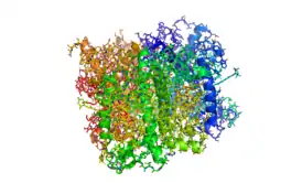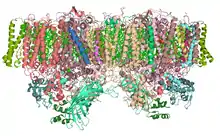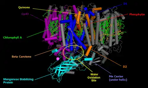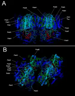 ![]() Структура димера фотосистемы II из цианобактерии Thermosynechococcus elongatus [8][7] | |
