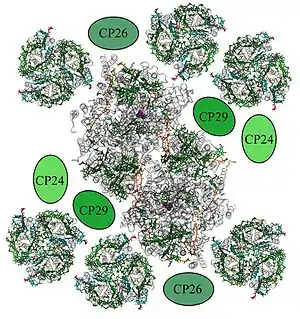 Внутренняя антенна фотосистемы II состоит из двух кодируемых хлоропластным геномом белков — CP43 и CP47, которые вплотную примыкают к центральному гетеродимеру D1/D2 (CP43 располагается вблизи D1, а CP47 — около D2). Белок CP43 ассоциирован с 13 молекулами хлорофилла а и 3—5 молекулами β-каротина[10]. CP47 несёт 16 молекул хлорофилла а и 5 молекул β-каротина. С этими антеннами контактируют внешние «минорные» антенны: CP29, CP26 и CP23, также известные как Lhcb4-6, причём CP26, CP29 и ССКII находятся в контакте друг с другом. Каждый из этих белков содержит по 18 молекул хлорофилла а, 9 молекул хлорофилла b и 6 молекул каротиноида[26]. Благодаря своему положению минорные белки осуществляют функцию регулирования стока энергии от внешних антенн на реакционный центр ФСII. Именно в минорных белках протекает виолоксантиновый цикл, играющий фотопротекторную роль при избыточном освещении и помогающий подготовить растение к смене дня и ночи[27].