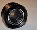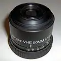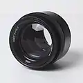 Объективы, предназначенные для увеличителей, имеют специальную конструкцию, поскольку в отличие от съёмочных их оптический расчёт выполняется не для «бесконечности», а для конечных коротких дистанций, лежащих в диапазоне между главным и удвоенным фокусными расстояниями. От других проекционных объективов они отличаются наличием ирисовой диафрагмы, позволяющей увеличивать глубину резкости и регулировать экспозицию при печати[* 1]. В СССР объективы, предназначенные для фотоувеличителей, маркировались дополнительной буквой «У», например, «Вега-11У»[26]. За рубежом аналогичная оптика также имеет соответствующую маркировку, например «EL Nikkor» (англ. EnLarger Nikkor)[27]. В некоторых случаях допустимо использование высококачественных съёмочных объективов. Фокусировка чаще всего производится визуально по резкости изображения на столе или листе бумаги. Однако, существуют приспособления, облегчающие наводку: специальные щелевые устройства в рамке негативодержателя и фокускопы. Часть увеличителей снабжены приспособлением для автоматической фокусировки («инверсором») с помощью специального лекала и рычажной системы[28][17].