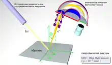 В фотоэлектронной спектроскопии применяются монохроматическое рентгеновское или ультрафиолетовое излучения с энергией фотонов от десятков тысяч до десятков эВ. Источником света в фотоэлектронных спектрометрах служит излучение рентгеновской трубки, разряда в гелии и синхротронное излучение. Регистрируется распределение электронов по кинетическим энергиям. Из закона сохранения энергии можно найти кинетическую энергию электрона