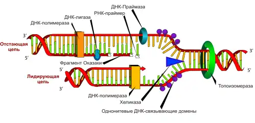 Каждый фрагмент Оказаки образуется рядом с репликационной вилкой после РНК-праймера, образуемого праймазой, и далее продолжается ДНК-полимеразой III в случае прокариот. У эукариот отстающая цепь синтезируется ДНК-полимеразой α. Праймер позднее удаляется ферментом с эндонуклеазной активностью, подобной РНКаза H, flap-эндонуклеазе и геликазе/нуклеазе DNA2L.