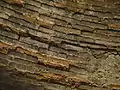 Способ устройства стен, ряд туфа, не пропускающего влагу и ряд кирпича