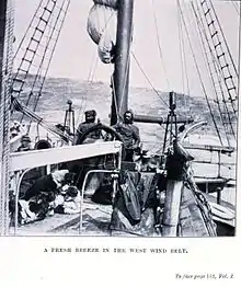 Проходя меридиан мыса Доброй Надежды, мы впервые попали в настоящую бурю. Поднялась высоченная волна, и тут мы узнали по-настоящему, на что способно наше замечательное судёнышко. Любой из этих могучих валов мог бы мгновенно опустошить всю нашу палубу, но «Фрам» этого не допускал. Всякий раз, когда волна настигала судно и, казалось, она сейчас обрушится на низкую корму, «Фрам» элегантно взмывал вверх, а гребень вала смиренно нырял под него. Даже альбатрос не мог бы лучше перевалить через волну. Известно, что «Фрам» рассчитан на льды, это верно, но верно и то, что, когда Колин Арчер создал свой знаменитый шедевр, его полярное судно стало одновременно и образцом судна с редкостными мореходными качествами. Увёртываясь от волн, «Фрам» поневоле кренился; мы это испытали на себе. Всё время, пока мы шли в поясе западных ветров, не прекращалась качка, но со временем мы свыклись и с этим неудобством[61].