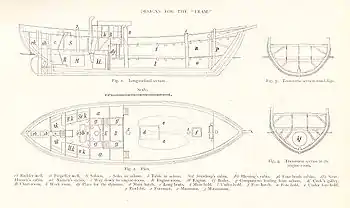 На «Фраме» имелось 8 шлюпок, в том числе два больших палубных баркаса длиной 8,8 м и шириной 2,2 м. Они имели парусное вооружение. Вместе они могли вместить весь экипаж с большим запасом провианта и предназначались для продолжения дрейфа в случае гибели судна. Баркасы были изготовлены из дуба и имели гладкую обшивку. Четыре малые шлюпки имели длину 6,3 и ширину 1,9 м, будучи изготовлены по образцу китобойных[41], они также были снабжены парусным вооружением, палубы не имели. Две из них были построены из дуба, и две — из вяза[42]. Имелся также моторный бот длиной 6,3 и шириной 1,6 м, но он принёс много хлопот и со временем был разобран. Имелась также малая плоскодонка (норвежский прам). Оба баркаса были размещены на большом трюмном люке, бот и прам крепились на палубе, четыре малые шлюпки висели на шлюпбалках[30].