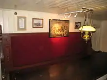 Выходы из кают-компании были снабжены тамбурами, они шли по обеим сторонам камбуза. Каждый тамбур закрывался четырьмя дверями. У передней переборки салона между тамбурами располагался длинный диван, перед которым стоял общий обеденный стол. Через салон проходила бизань-мачта, окружённая узкой скамьёй[55]. Убранство помещений было выполнено в норвежских национальных цветах — белом, красном и синем. Потолочный иллюминатор кают-компании был украшен витражом, на котором был изображён герб Норвегии. Кают-компания и каюты были украшены произведениями норвежских живописцев — подарками членам экспедиции. Оружие также хранилось в кают-компании[56]. У задней переборки кают-компании между дверями в каюты матросов располагалась керосиновая печь — единственный источник тепла, через её дымоход осуществлялась вентиляция. Каюты обогревались через вентиляционные отдушины в дверях. Зимой в помещениях поддерживалась температура +22 °C[57]. Нансен отмечал, что из-за печи воздух был излишне сухим: панели на стенах и потолке высохли и съёжились[58].