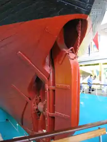 Старнпост был укреплён изнутри деревянными и железными кницами и массивным фалстарнпостом. В окно, через которое проходил сальник гребного вала, была вставлена U-образная металлическая рама, крепившаяся к килю и балкам рудерпоста и старнпоста. По обе стороны от неё были наложены аналогичные конструкции, которые были соединены сквозными болтами. Руль и винт можно было поднимать через колодцы на палубу и возвращать на место. Рулевое перо было размещено намного ниже ватерлинии, колодец можно было пропарить из машинного отделения, руль не должно было заклинить, даже если колодец целиком наполнялся льдом[39].