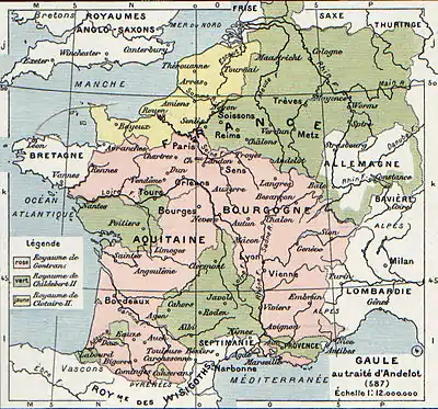 - Западно-Франкским королевством правил Карл Лысый. Это королевство является предвестником современной Франции. Оно состояло из следующих крупных феодальных владений: Аквитания, Бретань, Бургундия, Каталония, Фландрия, Гасконь, Септимания, Иль-де-Франс и Тулуза. После 987 года королевство стало известно под именем Франция, поскольку представители новой правящей династии Капетингов изначально являлись герцогами Иль-де-Франс.