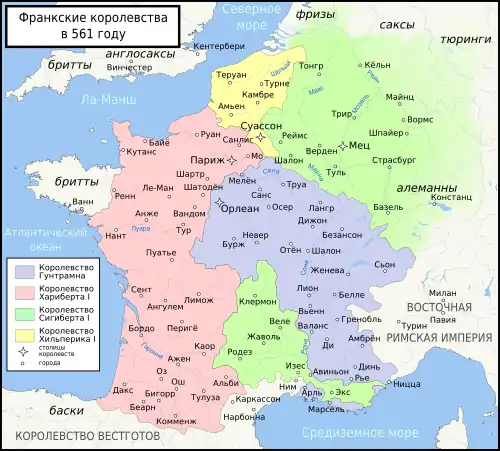 Когда в 561 году Хлотарь скончался от лихорадки в возрасте 64 лет, франкское государство было вновь разделено на 4 части между сыновьями Хлотаря. Столицы остались в тех же городах. Старший сын, Хариберт I, унаследовал королевство со столицей в Париже и правил всей западной Галлией. Второй сын, Гунтрамн, получил прежнее королевство бургундов, дополненное землями центральной Франции, окружавшими старую столицу Орлеан, а также большую часть Прованса. Малая часть Прованса, а также провинция Овернь и восток Аквитании отошли третьему сыну, Сигиберту I, который также унаследовал Австразию с её главными городами Реймс и Мец. Самое малое королевство — Суассон — досталось младшему сыну, Хильперику I. Это королевство Хильперика, после его смерти в 584 году, явилось основой возникшего впоследствии королевства Нейстрия.