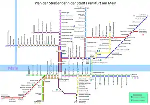 Сеть трамвайных рельсовых путей является составляющей Транспортного сообщества Рейна-Майна и состоит (на 2005 год) из десяти регулярных трамвайных линий и одной специальной. Длина линий в 2010 году составляла 63,55 км[1]. В том же году франкфуртский трамвай перевёз 49,2 млн пассажиров[1], что соответствует 19,7 % всего наземного транспорта в городе[2].