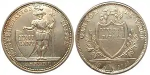 Конституция Швейцарии, принятая в 1848 году, устанавливала исключительное право федерального правительства на чеканку монеты. К этому времени монеты кантона уже не чеканились, последние монеты в раппах были выпущены в 1816 году, в батцах — в 1834, монеты во франках чеканились только в 1845 году. 7 мая 1850 года был принят федеральный закон о чеканке монет, в том же году начата чеканка швейцарских монет.
