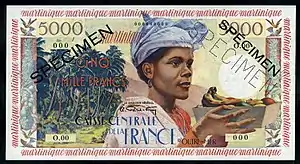 - Центральной кассы Заморской Франции с надпечаткой «Мартиника»: 5, 10, 20, 100, 500, 1000, 5000 франков;