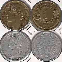 - С легендой «Французский Союз», «Французская Западная Африка» — 1, 2 франка,