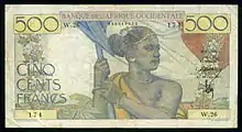 - Банка Франции с надпечаткой «Банк Западной Африки» — 100 франков,