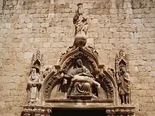 Единственным уцелевшим после землетрясения 1667 года элементом церкви оказался готический портал 1498 года, выходящий на Страдун и играющий роль главного входа в церковь. Этот портал был создан в местной мастерской братьев Леонарда и Петра Петровичей, его центральная часть представляет собой люнет над входной дверью с образом Пьета. Пьета окружена фигурами святого Иеронима и Иоанна Крестителя, над люнетом находится фигура Бога-Отца[3]. После землетрясения церковь была восстановлена в барочном стиле. Главный алтарь со скульптурой Христа Воскресшего в окружении четырёх мраморных витых колонн был создан Целием из Анконы в 1713 году, пять боковых алтарей — венецианцем Джузеппе Сарди в 1684—1696 годах. Над украшением алтаря св. Франциска работал в 1888 году известный хорватский художник Целестин Медович. В церкви похоронен поэт Иван Гундулич[4].