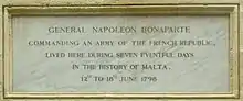 Французская оккупация Мальты началась в июне 1798 года, когда войска Первой республики под руководством Наполеона Бонапарта высадились на остров и заставили Мальтийский орден и гарнизон острова сдаться, и закончилась в 1800 году после двухлетней осады, которую вела антифранцузская коалиция. В течение двух лет Мальта фактически была частью владений Французской Республики, а на её территории действовало французское законодательство, по которому было введено множество республиканских новшеств. О следах оккупации напоминают разные таблички, установленные на фасадах зданий, ранее принадлежавших Мальтийскому ордену[2].