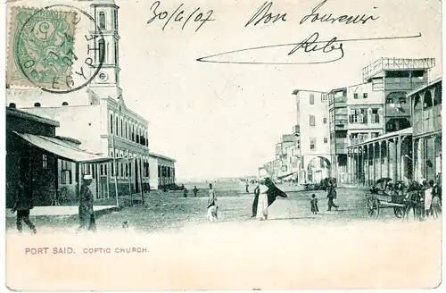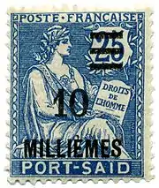![]() Надпечатка «Порт-Саид» 1899 года на марке типа Саж, номиналом в 4 сантима, погашенной в 1900 году | |