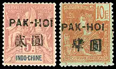 ![]() Марки Французского Индокитая с надпечаткой для использования в Пак-Хое (Бэйхае): слева — типа Мореплавание и торговля, 1903 (Sc #4); справа — 1906 (Sc #21)[^] | |
