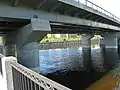 Промежуточные опоры железобетонные массивные с двумя стойками и устройством по верху ригелей. Массивные стойки каждой опоры опираются на монолитные ростверки, устраиваемые по буровым сваям диаметром 1,2 м с устройством уширения до 2,4 м. Устои моста железобетонные монолитные на свайных фундаментах; сваи буровые диаметром 1,2 м с уширением до 2,4 м. Задние грани устоев моста сопрягаются с подпорными стенами верхнего яруса набережной Обводного канала[12].