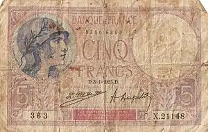 В годы Первой мировой войны Франция прекратила выпуск золотых монет[25]. В этот период вошли в оборот банкноты номиналом 5, 10 и 20 франков. При этом в 1914 году был приостановлен их размен на золотые монеты. В связи с изменением соотношения цен золота и серебра, политической нестабильностью в начале XX века и более активным использованием банкнот в 1920 году фактически прекратил существование Латинский валютный союз (формально он распался в 1927 году). В том же году монеты номиналом в 2, 1 и 1/2 франка, ранее чеканившиеся из серебра, начали чеканить из алюминиевой бронзы[26].