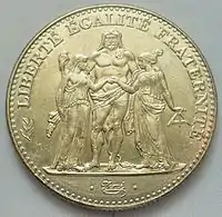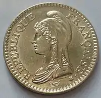 В результате того, что ливр обесценился, французы были вынуждены перейти на новую валюту. Франк сменил обесценившуюся денежную единицу в качестве основного расчётного средства. Новым законом от 18 жерминаля III года Республики (7 апреля 1795 года) прежняя денежная система, основанная на ливре (1 луидор = 4 экю = 20 счётных ливров = 400 су = 4800 лиардов), была заменена десятичной системой: 1 франк = 10 десимов = 100 сантимов. Законом от 28 термидора (15 августа) франк был официально введён в обращение. Монета достоинством 1 франк выпускалась весом около 5 г (содержание серебра 4,5 г). Первоначально чеканили монеты номиналом 1, 5, 10, 20, 25 и 50 сантимов, 1, 2 и 5 франков. Кроме того, выпускались золотые монеты достоинством в 100, 50, 40, 20, 10 и 5 франков[10].