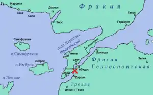 Встревоженные этими действиями спартанцев, афиняне послали флот из 40 трирем под командованием Фрасибула. Он, посчитав, что демократы на Родосе удержатся и без его помощи, поплыл в Геллеспонт. По пути он склонил несколько государств к дружбе с афинянами, затем в Византии сдал на откуп десятипроцентную пошлину с товаров, вывозимых с Чёрного моря, таким образом восстановив источник дохода, на который афиняне опирались в Пелопоннесской войне. После этого он приплыл на Лесбос, где при поддержке митиленцев победил спартанские войска, находившиеся на острове, и отвоевал много городов. Однако потом Фрасибул был убит жителями города Аспенда[58].