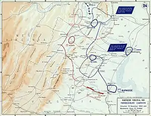 Фредериксбергская кампания (англ. The Fredericksburg Campaign) — серия манёвров и одно крупное сражение в ходе Гражданской войны в США, которые происходили в Северной Вирджинии в ноябре 1862 — январе 1863 года. Генерал Эмброуз Бернсайд, главнокомандующий федеральной Потомакской армии, пытался стремительным манёвром обойти Северовирджинскую армию генерала Роберта Ли, перейти реку Раппаханок у Фредериксберга и прорваться к Ричмонду. Ему удалось быстро выйти к Фредериксбергу, но наступление было сорвано отсутствием необходимых средств переправы. Не имея должного военного опыта и не обладая гибкостью ума, генерал Бернсайд растерялся и не смог своевременно скорректировать свои планы. Армия генерала Ли между тем заняла позиции на высотах за Фредериксбергом, и Бернсайд решил атаковать противника прямо на них. В сражении при Фредериксберге его армия понесла огромные потери без всякого результата и была вынуждена отступить за Раппаханок, но и Ли не смог воспользоваться слабостью противника и разгромить его. Бернсайд начал планировать обходной манёвр, однако был остановлен президентом. Только в январе 1863 года он возобновил наступление, но оно было сорвано дождями. Недовольство в рядовом и командном составе армии было так велико, что президент отстранил Бернсайда от командования.