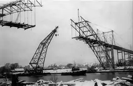 Строительство осуществляли норвежская компания F.Selmer AS и немецкая компания Stahlbau Eggers (металлическое пролетное строение)[5]. Сооружение опор началось весной 1954 г., бетонирование велось с использованием скользящей опалубки[7]. Из-за проблемы с возведением опоры на западной стороне реки центральный пролёт был увеличен со 180 до 196 м, опоры на восточной стороне были усилены[4]. Монтаж металлоконструкций моста начался весной 1956 года, металлоконструкции собирались на месте, для монтажа арки использовался плавучий кран из Осло. Торжественное открытие моста состоялось 18 августа 1957 года в присутствии кронпринца Улафа V.