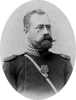За то, что в боях с 30 сент. по 6 окт. 1914 г., командуя полком, захватил с боя последовательно несколько позиций и затем удерживал в течение 6-ти дней наступление превосходных сил противника, не взирая на потери, достигшие 50% состава полка.