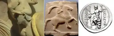 | Слева: голова македонского щитоносца с саркофага из Сидона (конец IV в. до н. э.). В центре: надгробное изваяние фессалийского всадника (IV в. до н. э., Лувр). Справа: монета Деметрия Полиоркета, македонского царя в начале III в. до н. э. | |