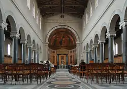 Здание представляет собой трёхнефную колонную базилику без трансепта с отдельно стоящей кампанилой высотой 42 м, прообразом для которой послужила кампанила римской церкви Санта-Мария-ин-Козмедин. Центральный неф на 13,50 метров выше боковых, которые согласно пропорциональному канону вдвое уже. Нефы разделяет колоннада с полуциркульными арками. Образцом для потсдамской Фриденскирхе послужила римская базилика Сан-Клементе. Фридрих Вильгельм в собственной строительной программе настаивал на следованию в церковной архитектуре раннехристианским и романским образцам. Он пожелал, чтобы в церкви был плоский кессонированный потолок. Апсида Фриденскирхе украшена настоящей венецианской мозаикой первой трети XIII века из шедшей под снос церкви в Сан Киприано на острове Мурано. Киворий на четырёх тёмно-зелёных колоннах из сибирской яшмы — подарок императора Николая I, женатого на родной сестре Фридриха Вильгельма, — был установлен в церкви в 1842 году.