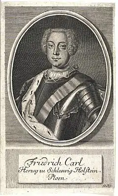 ![]() "Фридрих Карл, герцог Шлезвиг-Гольштейн-Зондербург-Плёна", гравюра середины XVIII века | |