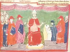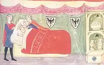 | Свадьба Генриха и Констанции. «Новая хроника» Biblioteca Vaticana, ms. Chigiano L VIII 296, f. 22v Джованни Виллани | Констанция передаёт новорождённого сына герцогине Сполето. «Новая хроника» Biblioteca Vaticana, ms. Chigiano L VIII 296, f. 65v Джованни Виллани | Сицилийское королевство |