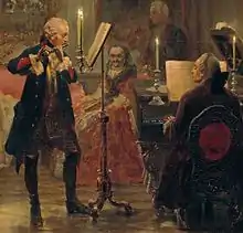 В области музыки Фридрих II прославился ещё и тем, что в 1747 году пригласил к себе в Потсдам Иоганна Себастьяна Баха. Результатом этой встречи стало Музыкальное приношение Баха — большой цикл произведений, написанных на тему, сочинённую и предложенную Баху королём. Эта тема вошла в историю музыки как "королевская тема". При дворе короля жили и работали крупные композиторы и музыканты-инструменталисты своего времени, среди них: флейтист, композитор, крупнейший музыкальный теоретик того времени и личный учитель короля по флейте Иоганн Иоахим Кванц, которого он предпочитал и ценил выше всех других служивших у него музыкантов, сын Иоганна Себастьяна Баха композитор Карл Филипп Эммануил, композитор и клавесинист Кристоф Шаффрат, композиторы Карл Генрих Граун, Иоганн Готлиб Граун, Иоганн Фридрих Рейхардт, композитор и органист Иоганн Фридрих Агрикола, композитор, лютнист и музыкальный теоретик Эрнст Готлиб Барон, композитор и музыкальный теоретик Карл Фридрих Христиан Фаш, знаменитый чешский композитор и скрипач Франтишек Бенда, его младший брат композитор и скрипач Йиржи Антонин Бенда, флейтист, композитор и музыкальный теоретик Фридрих Вильгельм Ридт, композитор и музыкальный теоретик Иоганн Филипп Кирнбергер. Для капеллы приобретались струнные инструменты лучших итальянских мастеров Амати и Страдивари.