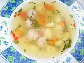 Суп с фрикадельками — это суп, приготовленный на медленном огне с фрикадельками и другими ингредиентами. Классический суп с фрикадельками состоит из прозрачного бульона, картошки, фрикаделек и овощей. Также в суп можно добавлять гречневую крупу, рис, макароны[6], кукурузную или ячневую крупу. Для фарша используется говяжье, свиное, баранье мясо.