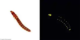 У личинок есть несколько органов-фотофоров, испускающих свет различных оттенков — красного и желто-зеленого[5]. Желто-зеленый свет производится 11 парами фотофоров по бокам сегментов вдоль тела, образующими два параллельных ряда. Красный свет производится двумя фотофорами на голове[5][6][7]. Жук может «перевести» все или несколько точек на одну сторону тела. Ярко-красные точки на голове только у самки.[8]