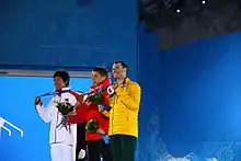 Официальная церемония награждения победителей: слева Цзя Цзунъян (бронза), в центре Антон Кушнир (золото), справа Дэвид Моррис (серебро)