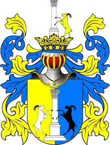 В щите наполовину разделенном, в правом золотом поле серая коза поднявшаяся на дыбы, а в левом, голубом, такая же чёрная коза; обе упираются в серебряную колонну с золотою короною, в самом разрезе щита поставленную.
